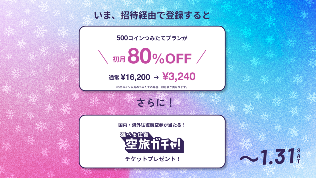 500コイン以上のつみたてで新規会員登録すると、往復航空券が当たる「空旅ガチャ」を1回チャレンジできるよ!