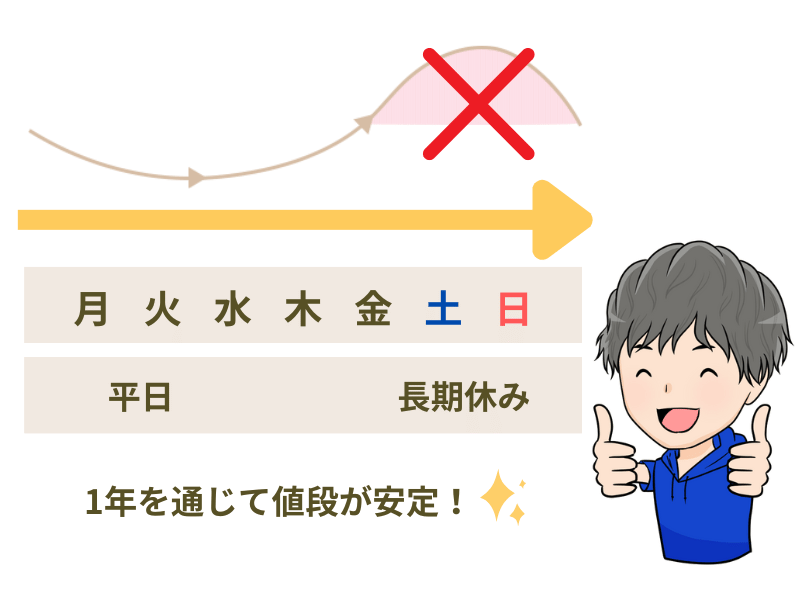 旅行の予約では土日や連休にかかると料金が高くなることが多いけど、HafHはこの価格差を抑えてるから値段が安定している!
