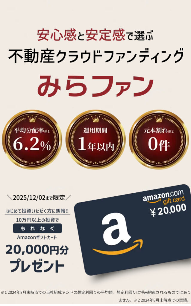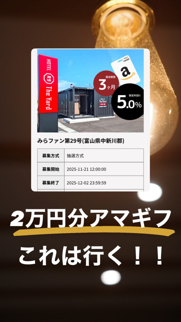 みらファンに初めて10万円以上投資すると、2万円のアマギフ確定😳✨